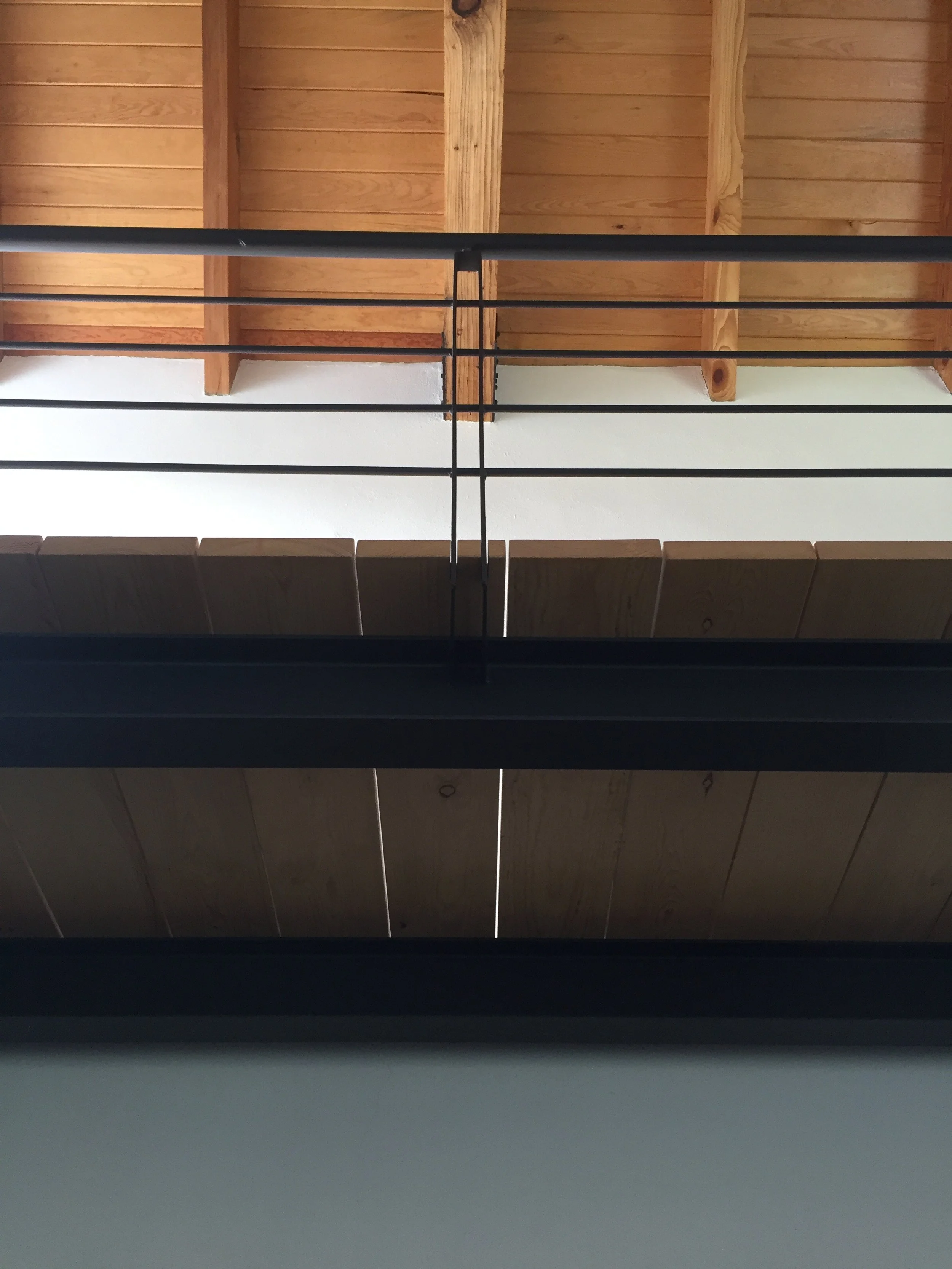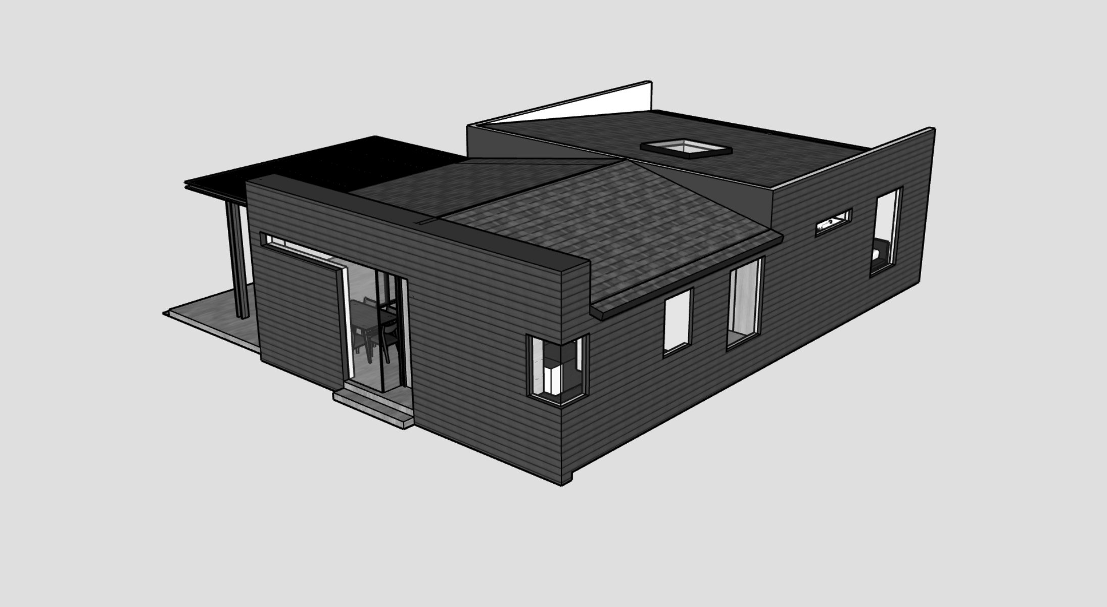Materials used: Hardie horizontal siding, natural wood, white interiors; the only color is the green entry door.
