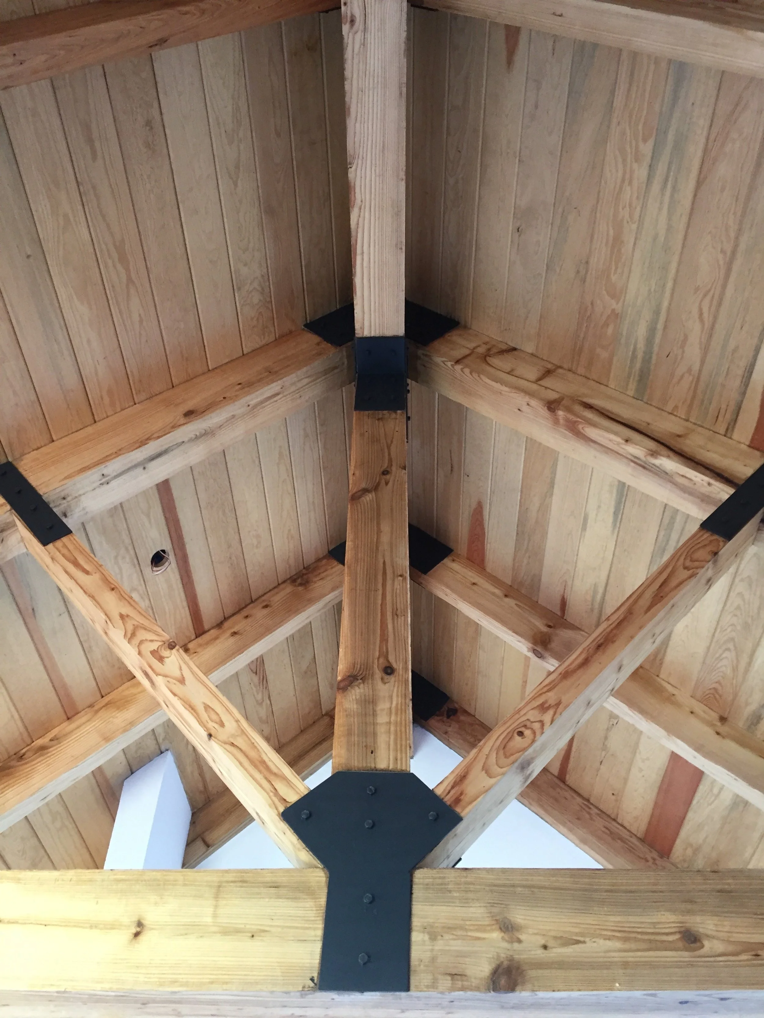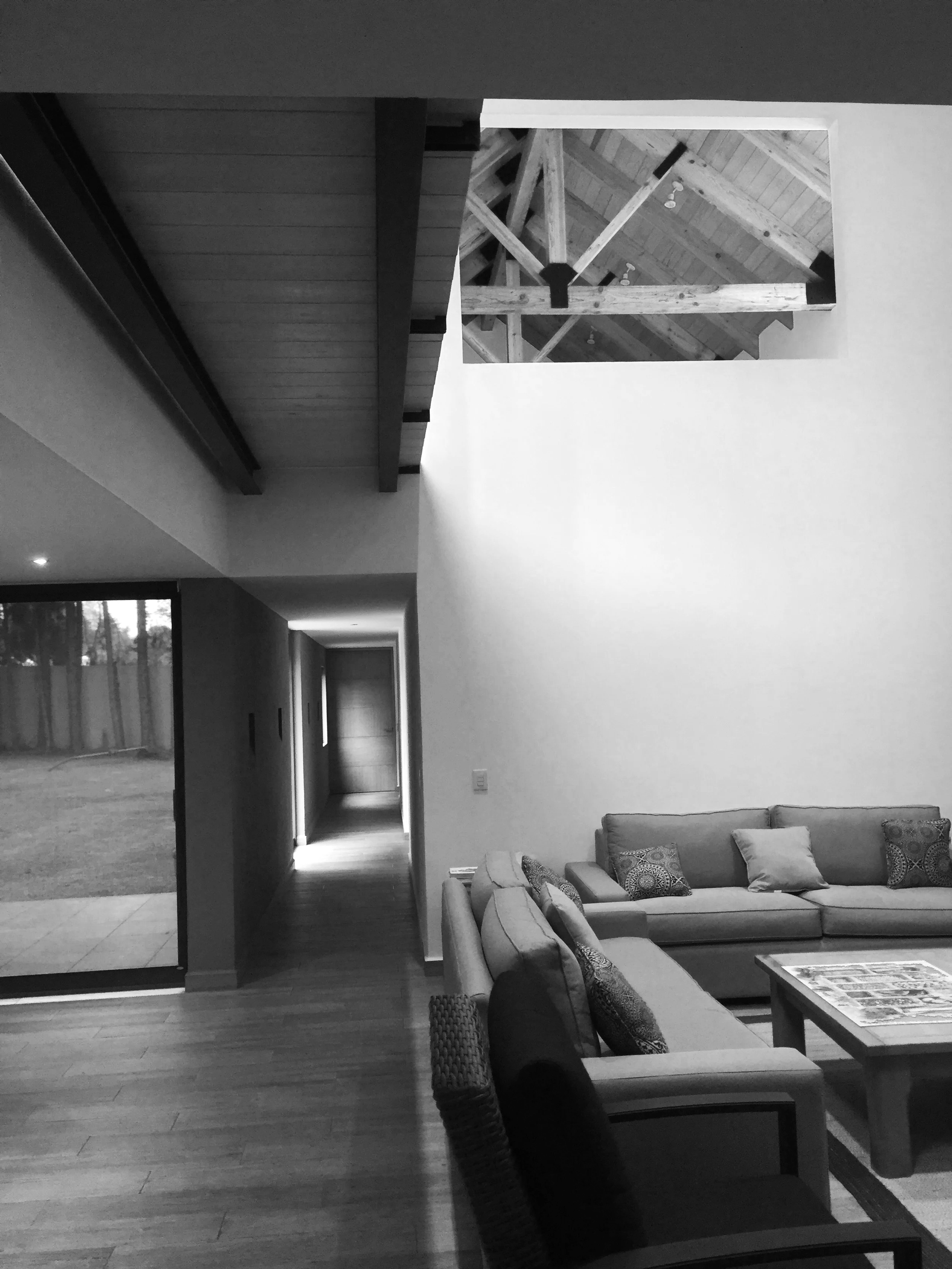 At the beginning, a one-story project was completed, but through the process, the clients decided to double de size by adding height to the second story. The “L” shape layout with vistas to the yard and facing south remained, as in the first scheme. Allowing cathedral ceilings and exposed trusses. A double fireplace faces the living room, and the deck that is covered by a louvered pergola.